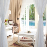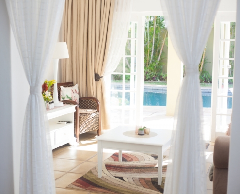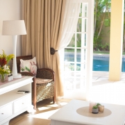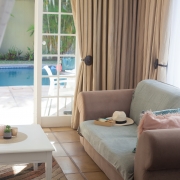 This luxurious room has a spacious bedroom and separate lounge with French doors opening up onto the pool area giving you direct external access to your room. In the bedroom you have a king-size bed and a tasteful modern en-suite bathroom with shower. In the lounge area a large sleeper couch (which converts to a bed for children up to the age of 12) and additional seating ensures maximum comfort and makes this unit ideal for families.