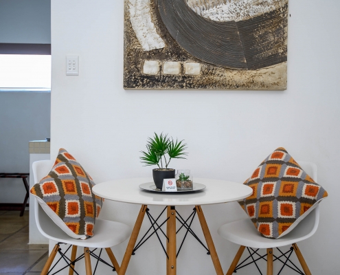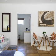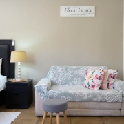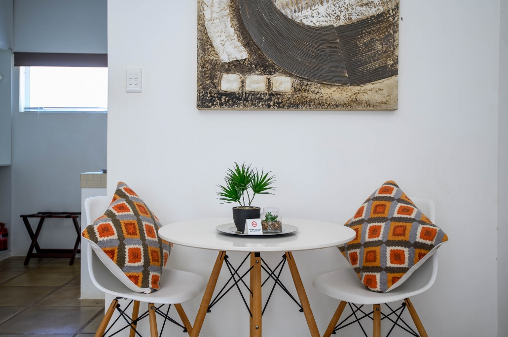 This striking luxury room is located to the side of Caza Beach Guest House with private access through a courtyard under trees creating a charming outside seating area right on your doorstep. The large bedroom includes a king-size bed, a large sleeper couch (which converts to a bed for children under 12) and dining table. The separate family sized bathroom includes a bath and shower.